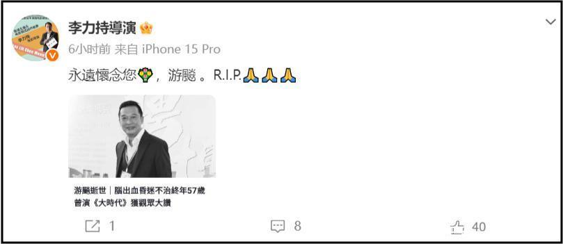 游飚去世的消息被曝光后,令人震惊和心痛。目前网友们和李力持、雷晴雯等港圈人士纷纷发文悼念游飚。