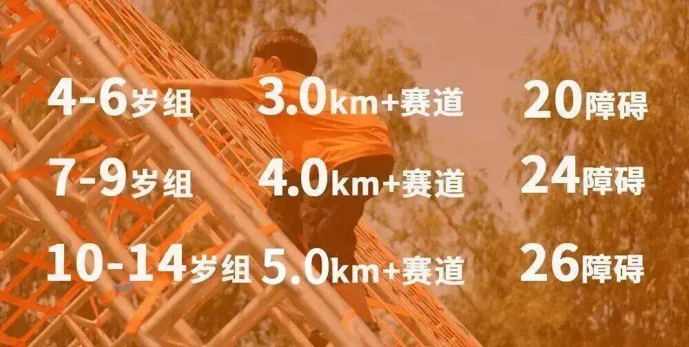 年龄组别:4-6岁组:3公里20个障碍 7-9岁组:4公里24个障碍 10-14岁组:5公里26个障碍